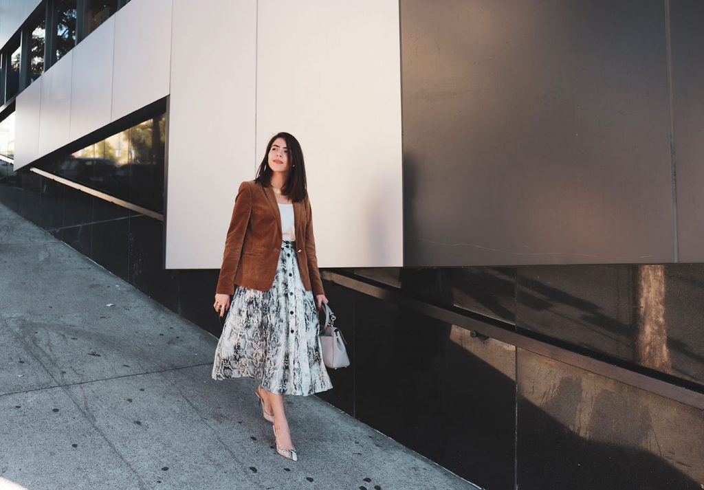 The third part of “One Garment, 4 Ways To Wear It” wearing the same snake print skirt with shoes in the same snake print. What I love about this trend is that you can take the risk of mixing the print with bright colors and same print from head to toe.